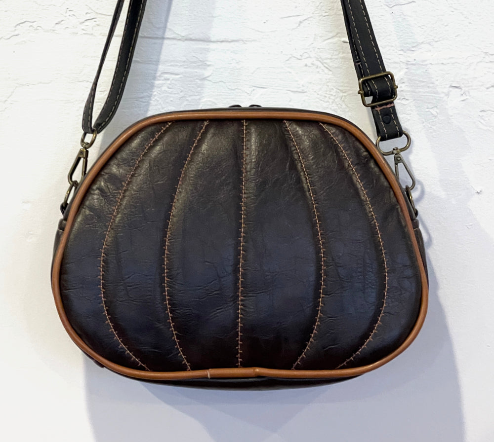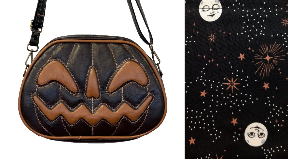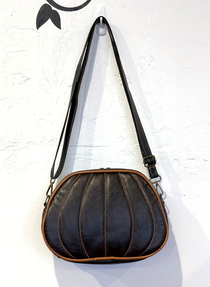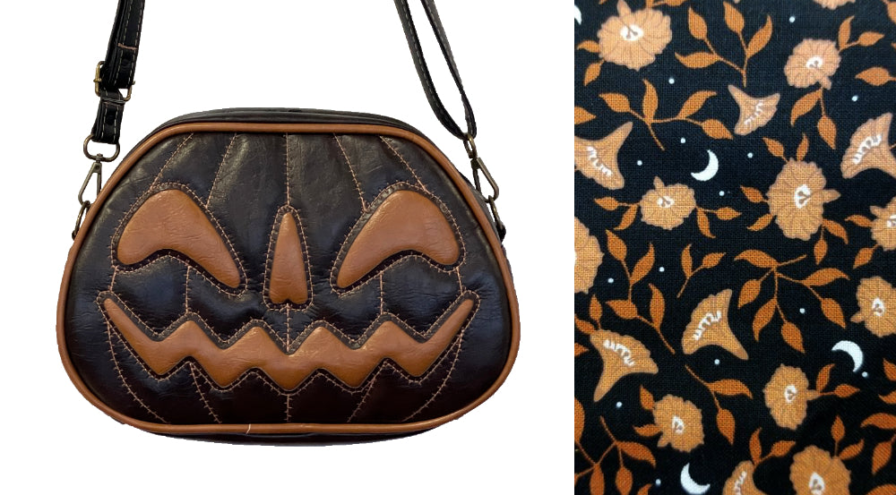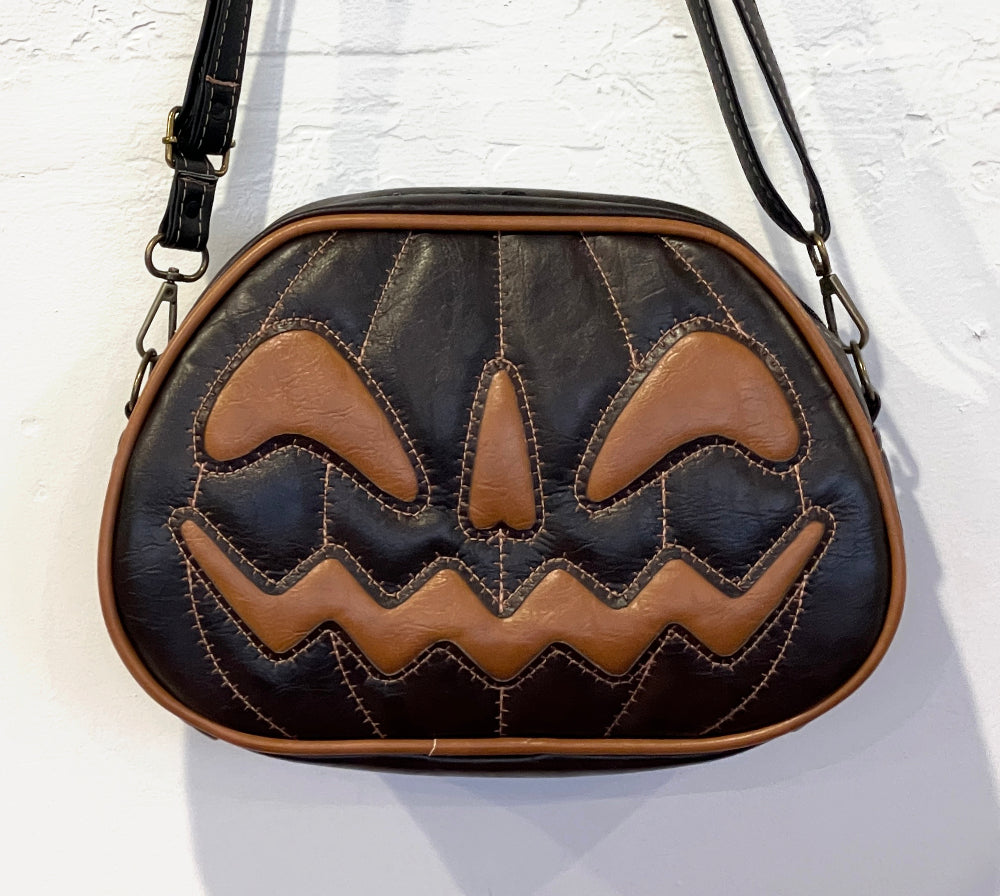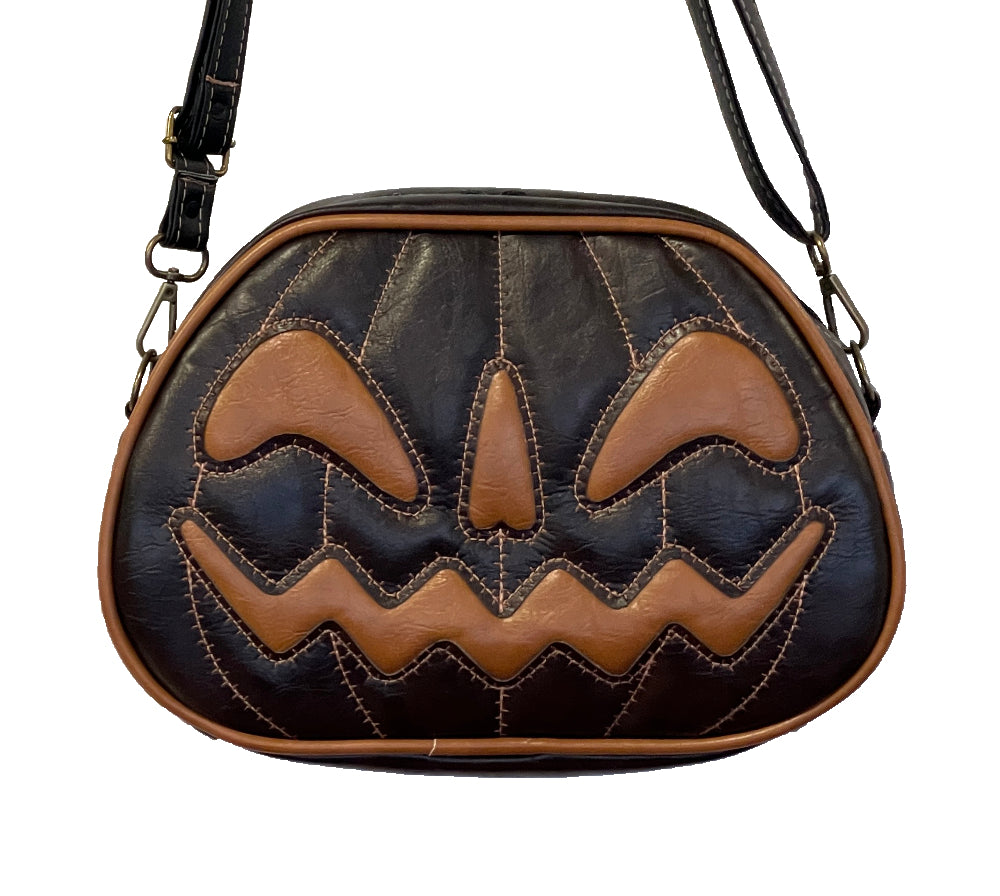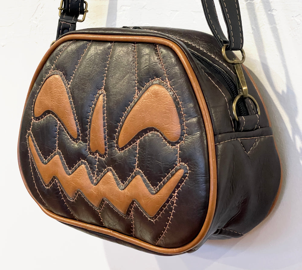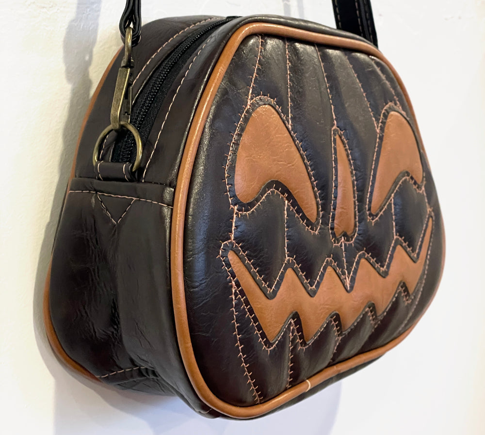 Our Burnt Umber pumpkin is made with dark brown leather-like vinyl with a warm light brown vinyl face, and features our signature Frankenstein stitching in light brown on both the front and back of the bag.