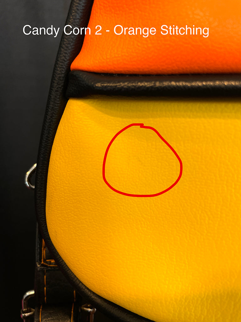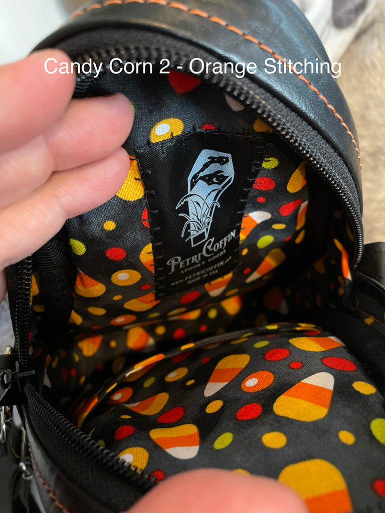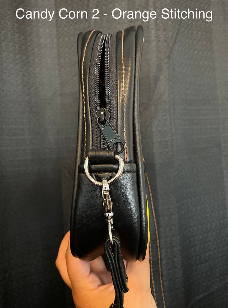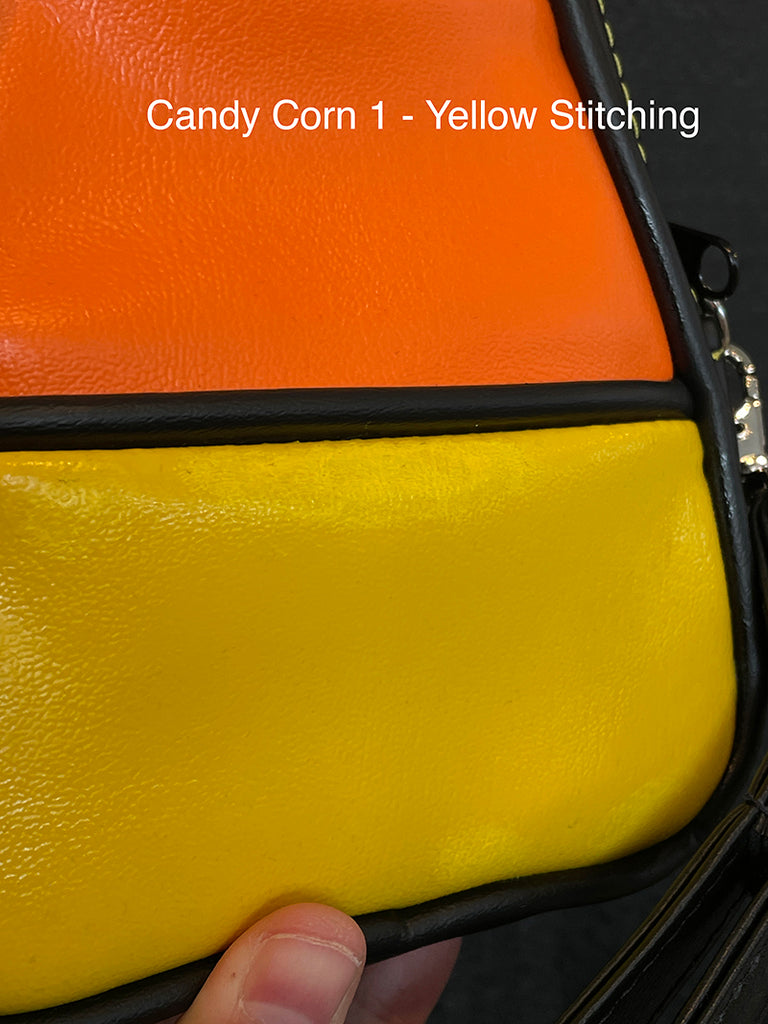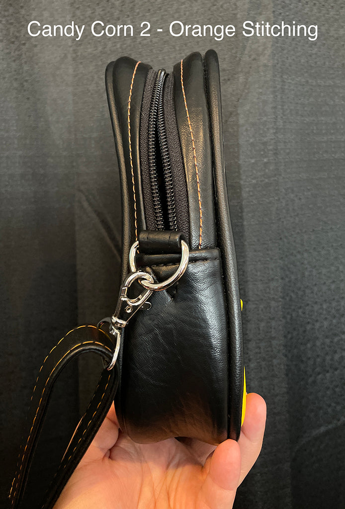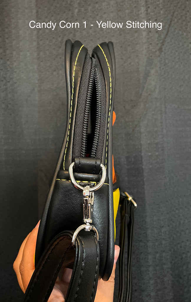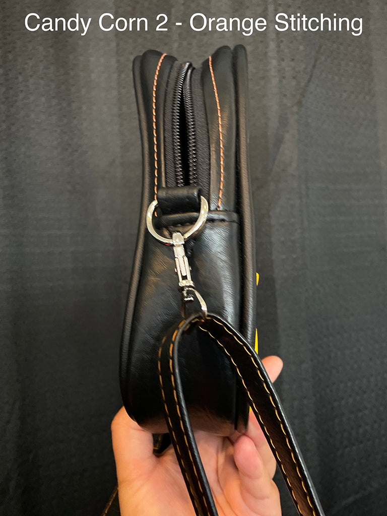 This cute little candy corn bag is perfect for a night out, a day trip, or traveling with you to concerts or conventions! Made with soft matte vinyl, and with the candy corn design on both the front and back sides of the bag.