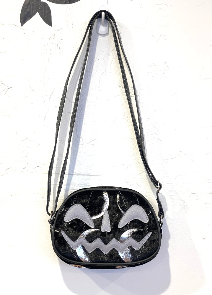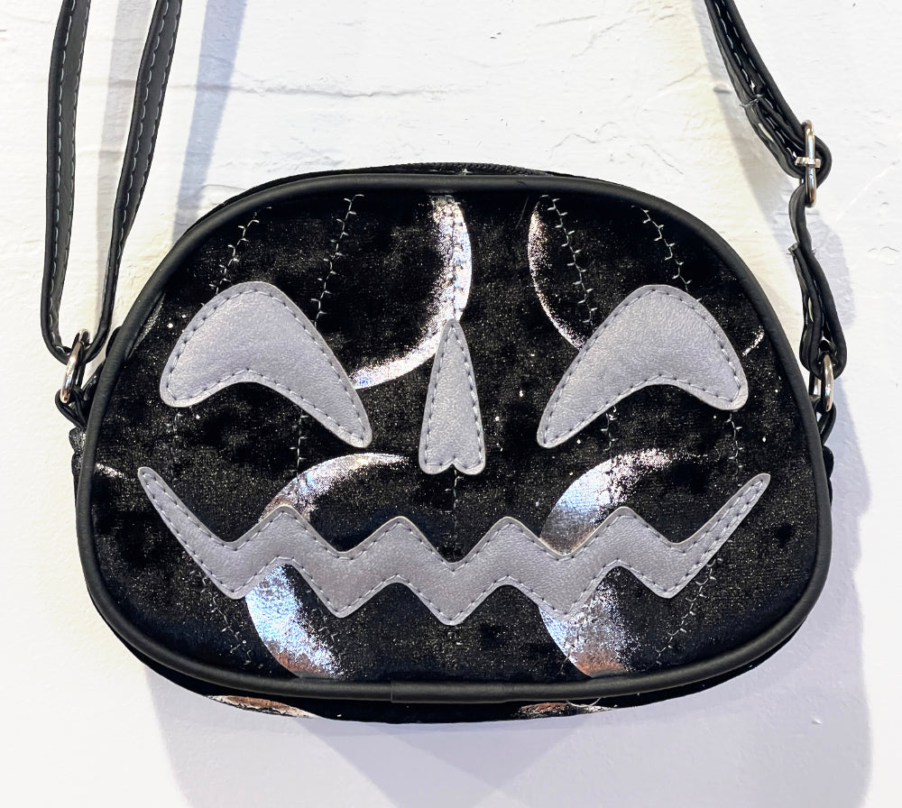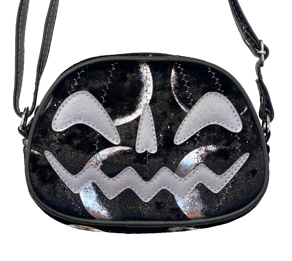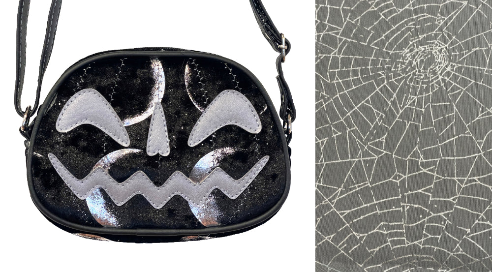 Lunar is a textured black velvet with silver foil moons and a gray vinyl face, and features our signature Frankenstein stitching in silver on both the front and back of the bag. Has 1 inner slip pocket.