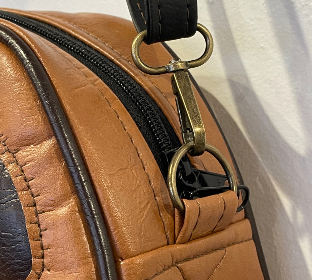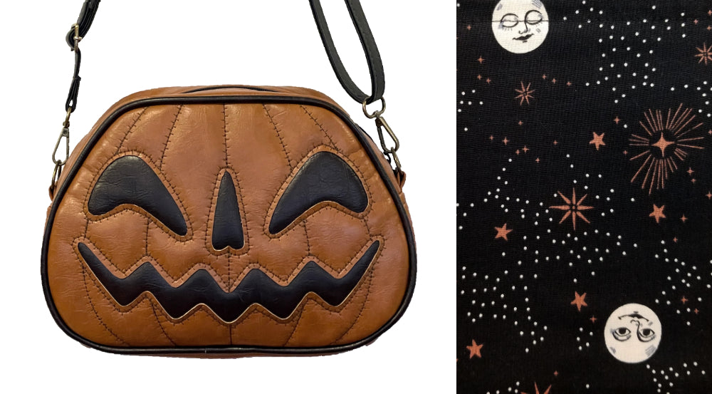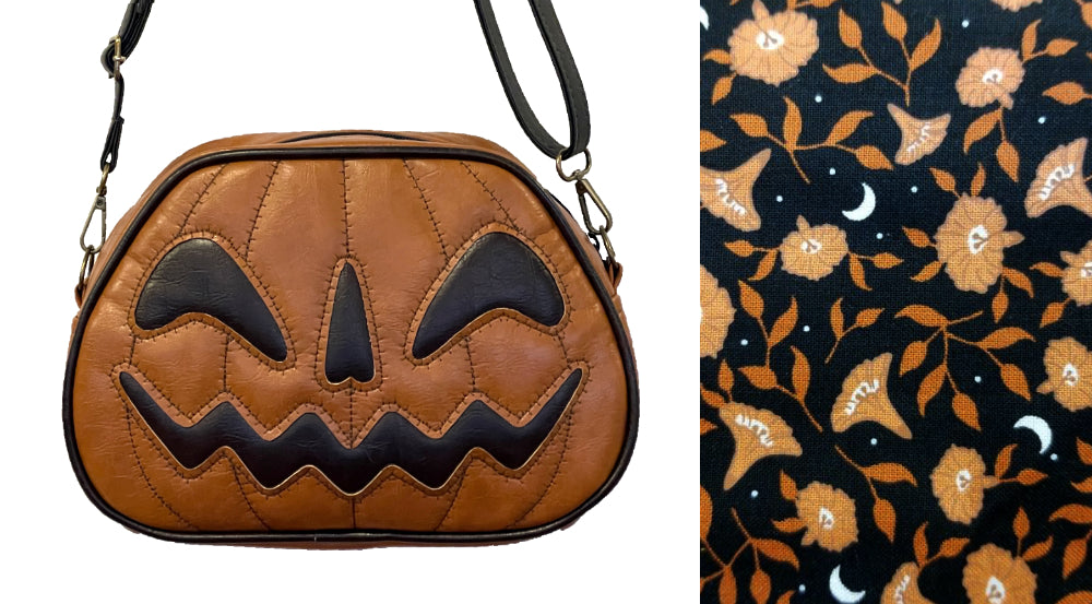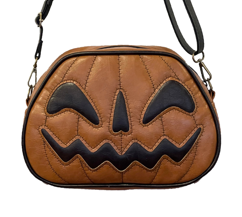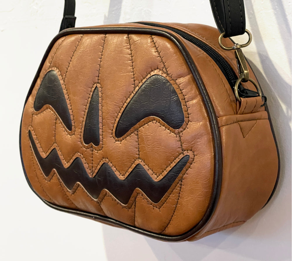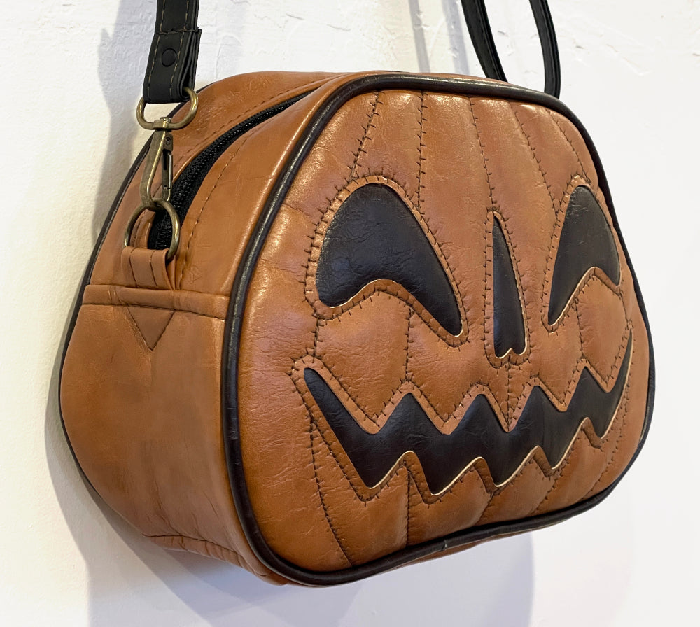 Our Raw Sienna pumpkin is made with warm brown leather-like vinyl with a dark brown vinyl face, and features our signature Frankenstein stitching in dark brown on both the front and back of the bag.