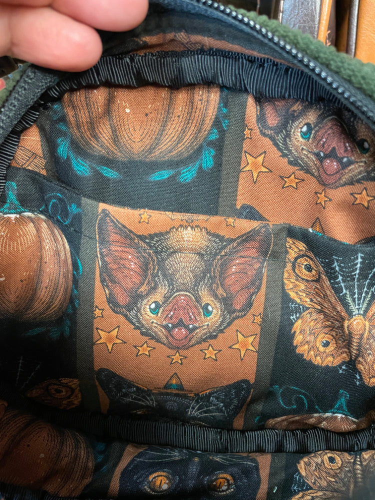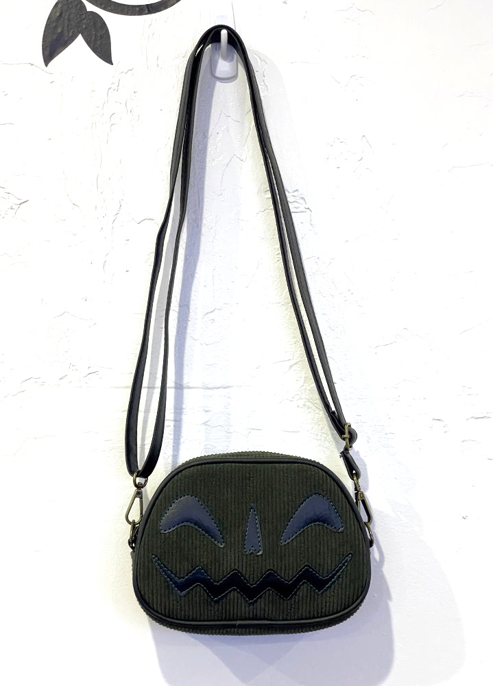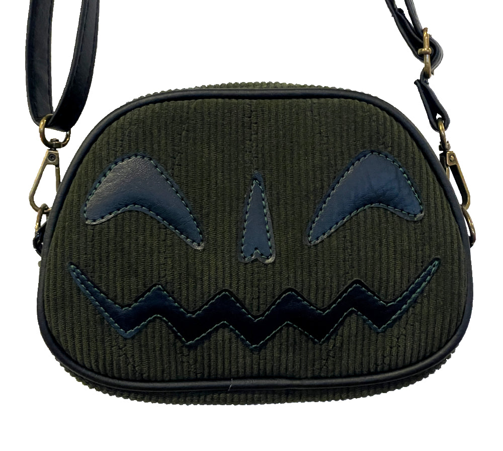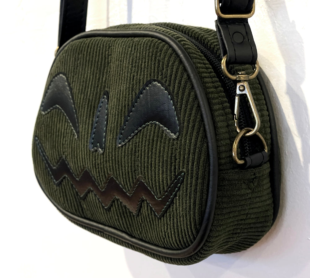 This Portland little punkin' is made with dark green corduroy with a black vinyl face, and features our signature Frankenstein stitching in black on both the front and back of the bag. Has 1 inner slip pocket.