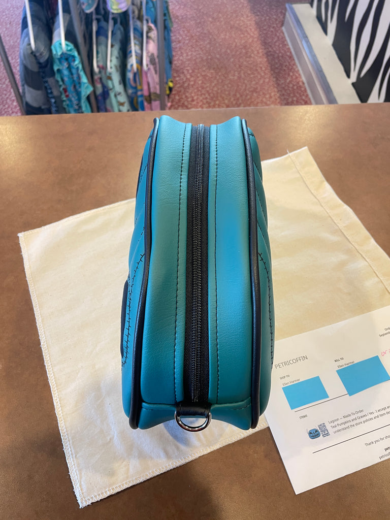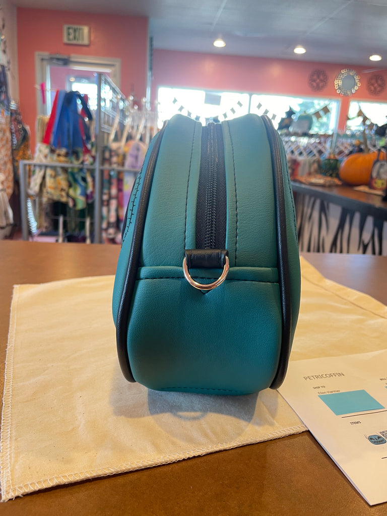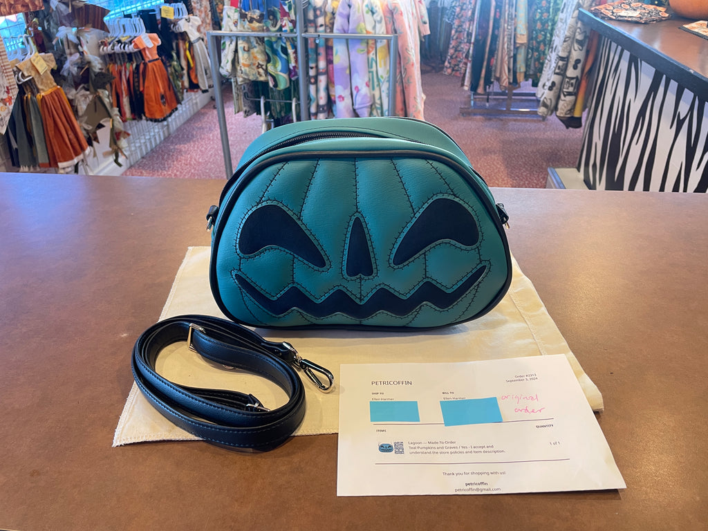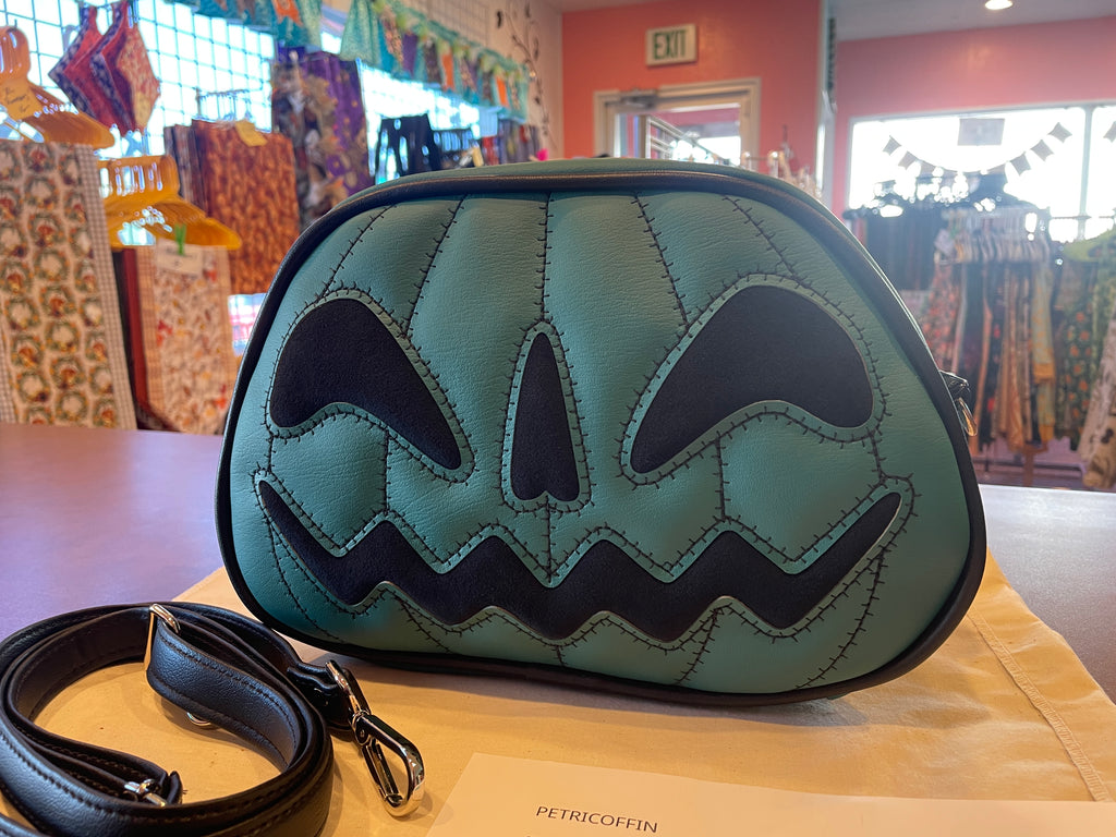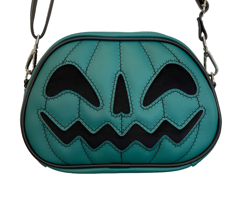 This gorgeous pumpkin purse is made with a moody dark teal vinyl, featuring a rich black velvet face and our signature Frankenstein stitching in black on both the front and back of the bag.