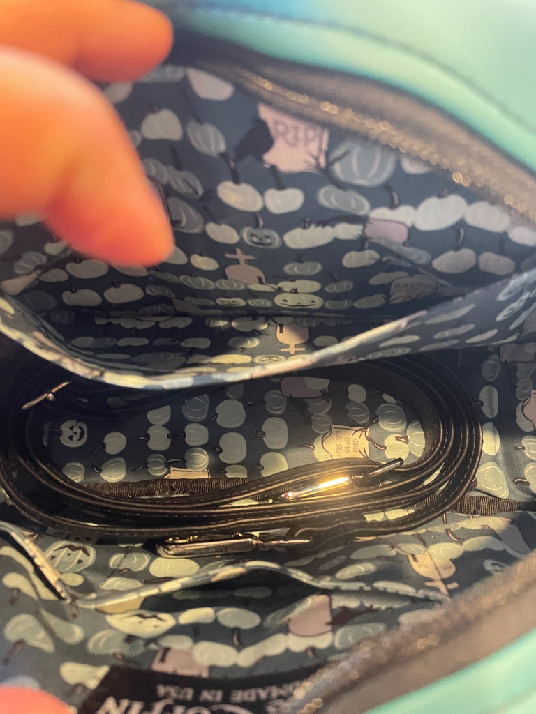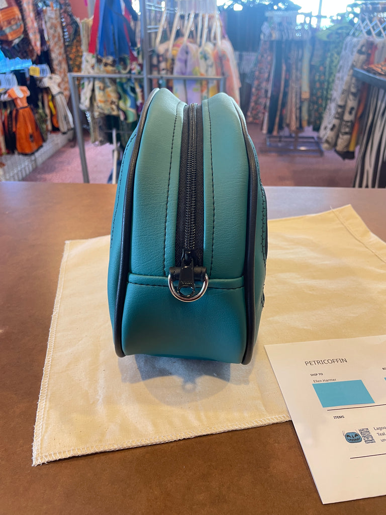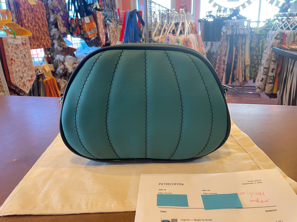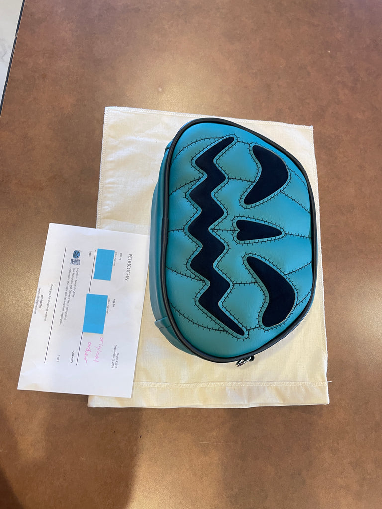 This gorgeous pumpkin purse is made with a moody dark teal vinyl, featuring a rich black velvet face and our signature Frankenstein stitching in black on both the front and back of the bag.