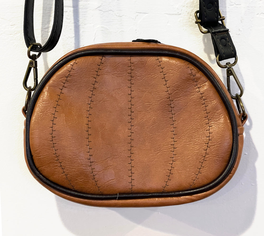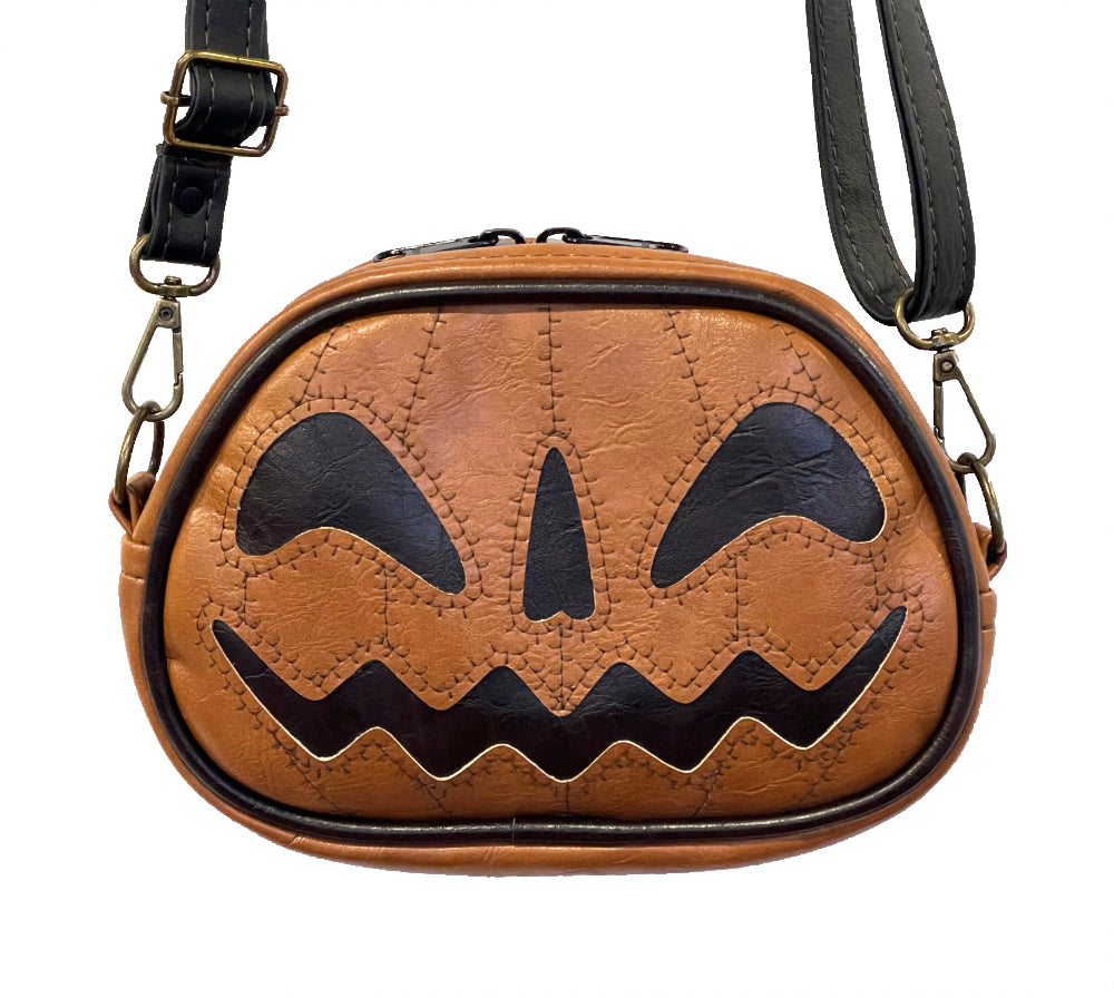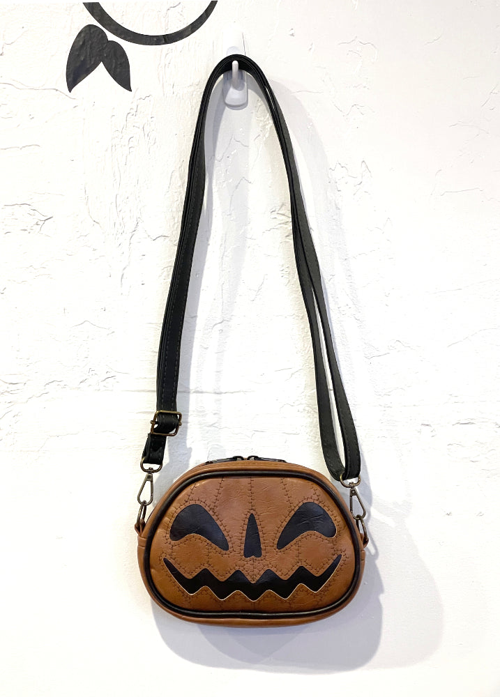 This little punkin' is a warm brown leather-like vinyl with a dark brown vinyl face. It features our signature Frankenstein stitching in dark brown on both the front and back of the bag. Has 1 inner slip pocket.
