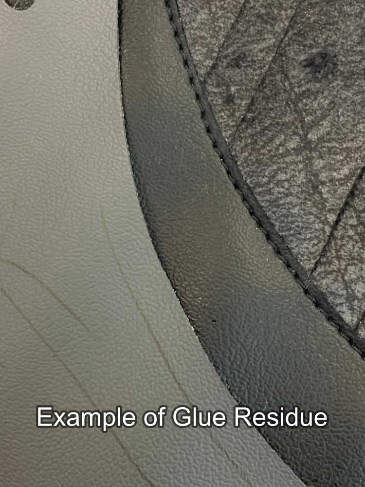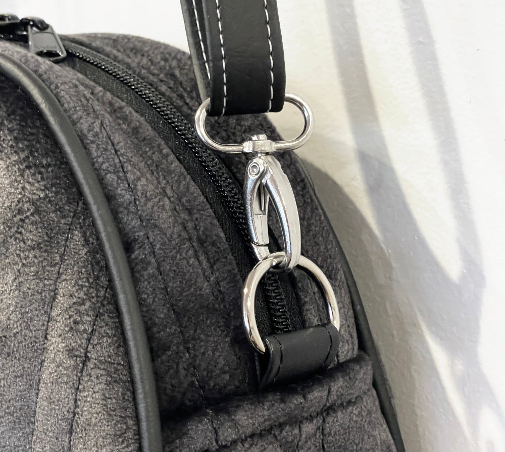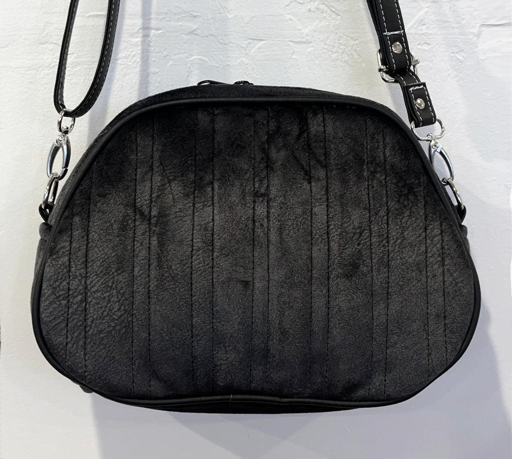 SHRIEK is a lovely combination of black and gray vinyl with super soft gray textured velvet. It features white and black stitching, with a ribbed texture on the back and sides.