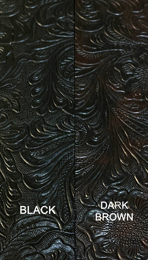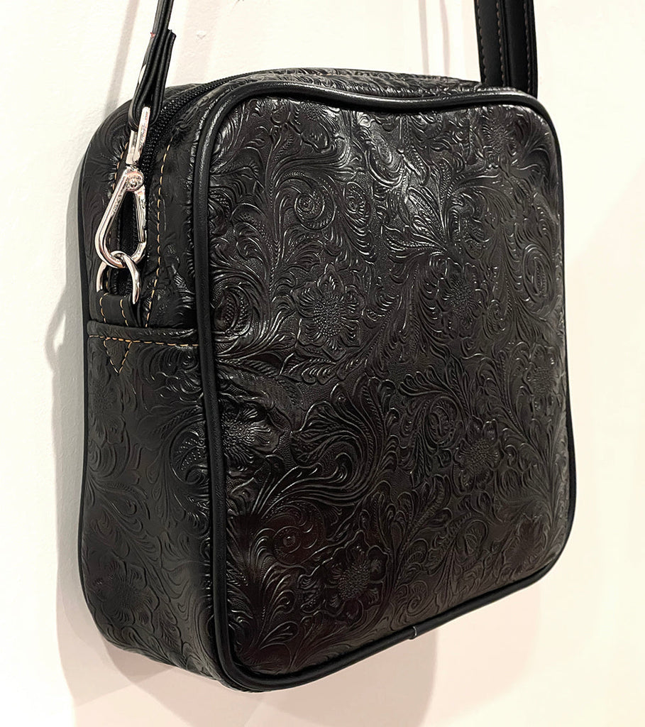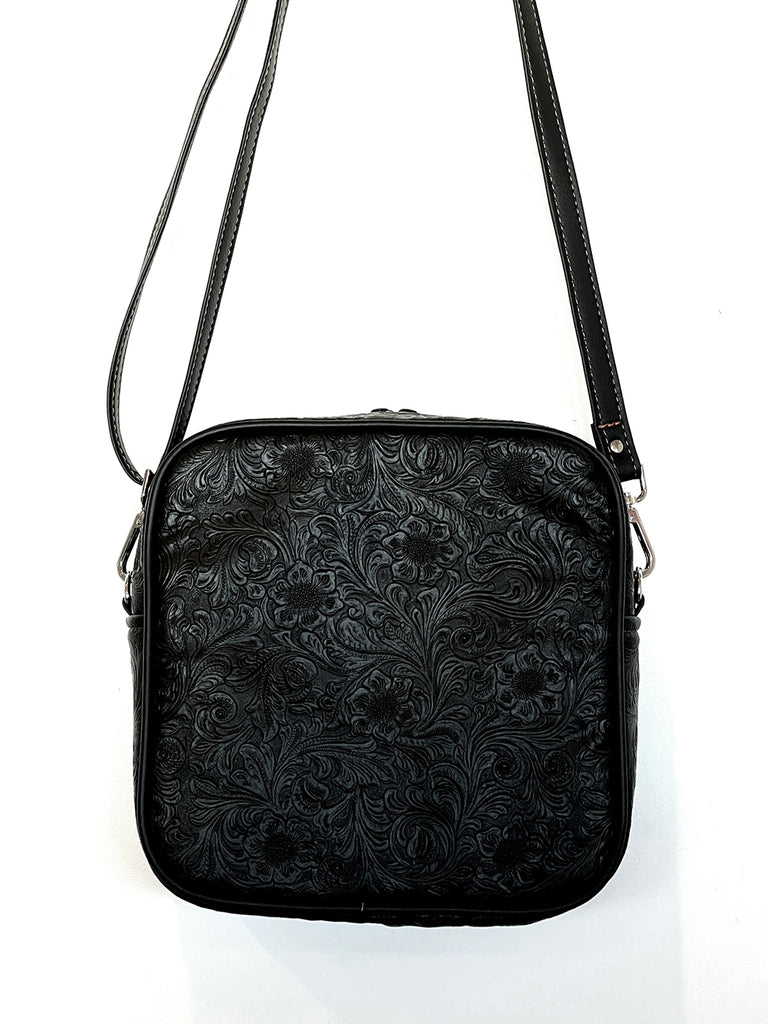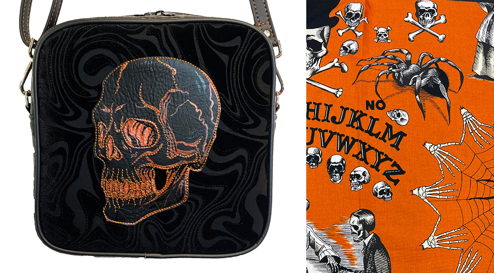Our Skull - Black Swirl bag features a hand-painted black skull with metallic details, on top of a burn-out velvet swirled background. The back and sides of the bag are a black embossed western floral vinyl.Ā