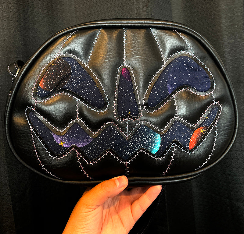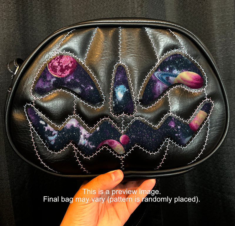 This space pumpkin is made with black vinyl, featuring a cotton fabric face with a planets and stars pattern and our signature Frankenstein stitching in pastel blue, pink, and white on both the front and back of the bag.